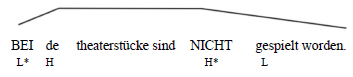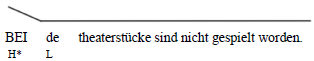 In (38a) handelt es sich um eine gespaltene Topikalisierung, bei der beide einen steigenden Akzent aufweist, im Gegensatz zu (38b), wo das Indefinitpronomen fallend realisiert wird. Die Wahl der Hutkontur in (38a) signalisiert, dass nicht beide Theaterstücke gespielt worden sind, sondern möglicherweise nur eins. So hat hier nicht Skopus über beide. In (38b) hingegen signalisiert der fallende Akzent auf beide, dass kein Theaterstück gespielt wurde. In diesem zweiten Fall hat beide Skopus über nicht. Außerdem kann die Form des Akzents auch bestimmen, wie eine Nominalphrase zu intendieren ist: