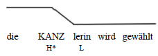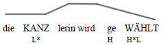 In (39a) deutet der Anstieg auf Kanzlerin, gefolgt von einem Fall auf gewählt, auf eine prädikative oder allgemeine Interpretation des Satzes hin. Der Satz kann folgendermaßen paraphrasiert werden: Wenn jemand Kanzlerin ist, dann wird sie gewählt. Der Fall auf Kanzlerin in (39b) impliziert hingegen eine referentielle Interpretation: Es ist die Kanzlerin, die gewählt wird.