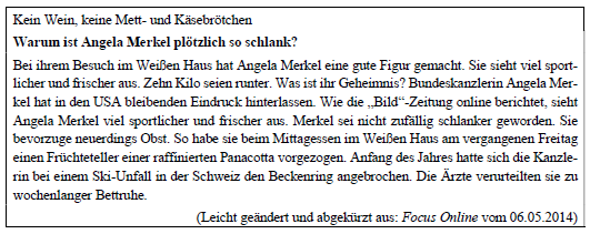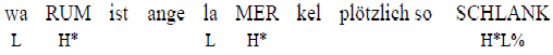 Betont werden in dieser Intonationsphrase die Silben rum, merund schlank; die Intonationskontur ist fallend (\). Im Gegensatz zu vielen anderen Sprachen (vor allem den romanischen Sprachen) besitzt die prototypische W Frage im Deutschen keinen steigenden, sondern einen fallenden Grenzton, genau wie beim prototypischen Aussagesatz. Der fallende Akzent liegt auf dem Adjektiv schlank. Er wird durch einen Hochton kodiert, der auf das erste Thema hinweist: Im Text geht es um die neue schlanke Figur der Kanzlerin. Die steigenden Akzente auf warum und angela merkel signalisieren zwei Topiks, die dafür zuständig sind, das Thema des”Schlankseins“ zu verengen und auf eine bestimmte Person, also die Kanzlerin (Angela Merkel), bzw. auf die Beschreibung der Gründe (Warum), die zum neuen Aussehen der Politikerin beigetragen haben, einzuschränken. Nach Verarbeitung der Schlagzeile wird nun klar, worauf sich die Aufmerksamkeit des Lesers konzentrieren soll, um den Informationsbedarf zu befriedigen. Es wird außerdem verdeutlicht, welche Funktion der zuvor eingeführte verbelliptische Satz (Kein Wein, keine Mettund Käsebrötchen) im Kohärenznetz erfüllt: Es handelt sich dabei um einen impliziten, nicht eingeleiteten Kausalsatz, der auf die Frage nach dem Warum? eine Antwort liefert und die Gründe bzw. die Mittel auflistet, die die Kanzlerin zum Abnehmen geführt haben könnten.