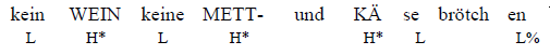 Als Kopfzeile des Zeitungsartikels liefert der Satz als Antwort zur allgemeinen Kontextfrage {worum geht es?} die allererste Information zum Textthema. Es handelt sich dabei um einen Ganzfokus Satz, in dem jedes Segment – da im Diskurskontext noch nicht gegeben – F markiert sein muss. Der einzige fallende Akzent der Phrase liegt bei der ersten Silbe von Käsebrötchen, während die anderen Akzentsilben (Wein und Mett) einen steigenden Hochtonakzent aufweisen. Das ist bei Foki immer dann möglich, wenn es sich, wie in diesem Fall, um eine Aufzählung von asyndetisch gereihten Elementen handelt. Solche Titelund Präsentationsäußerungen, die hier eine für die Pressesprache typische verbelliptische Struktur aufweist, werden in der Literatur in Bezug auf einen bestimmten Fokustyp untersucht, der im Vergleich zum klassischen Fokus Informationen im Diskurs ergänzt, ohne explizit erfragt worden zu sein. Culicover/Rochemont (1983) sprechen hierbei von presentation focus (= Präsentationsfokus).