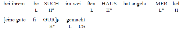 Fokusexponent ist hier das Wort figur, dessen zweite Silbe gur einen fallenden Hochtonakzent aufweist. Bei einer Kontextanbindungsfrage der Art {was hat Angela Merkel bei ihrem Besuch im Weißen Haus gemacht?}projiziert der informative Fokus über den eigentlichen Fokusexponenten hinaus und erreicht die ganze Nominalphrase (eine gute Figur). Diese Intonationsphrase weist ebenso Tonhöhenakzente auf, die vom Hintergrundmaterial (bei ihrem besuch, im weißen haus, hat, angela merkel, gemacht) steigend hervortreten und die zu befriedigende Mitteilung (was? > eine gute fiGUR) auf bestimmte Ereignisse einschränken wollen. Diese betreffen die Silbe such (bei ihrem beSUCH) und Haus (im weißen HAUS). Es handelt sich dabei um zwei Topiks, die den Gehalt der fokussierten Information auf eine bestimmte Zeit (bei ihrem Besuch – und nicht bei ihrem Urlaub etc.) und einen bestimmten Ort (im Weißen Haus – und nicht im Buckingham Palace etc.) verengen wollen. Da sie zum ersten Mal präsentiert und dem Diskurskontext neu hinzugefügt werden müssen, sind beide mit einem Hochtonakzent auszusprechen. Die Nominalphrase Kanzlerin Angela Merkel hingegen wurde im vorigen Kontext bereits erwähnt und bekommt daher einen Tieftonakzent.