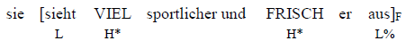 In dieser IP steigt der Stimmdruck bei viel an und fällt nach der betonten Silbe frisch wieder ab. Semantisch bezieht sich der Satz auf den vorigen, mit dem er kausal verknüpft ist. Er nennt den Grund, warum Angela Merkel bei ihrem Besuch im Weißen Haus eine gute Figur abgegeben hat – etwa wie in der kontextuellen Frage {warum hat sie (bei ihrem Besuch im Weißen Haus) eine gute Figur gemacht?}. Aus diesem Grund breitet sich das Fokus vom Exponenten frischer auf die ganze Verbalphrase ([weil] sie sieht viel sportlicher und frischer aus) aus.