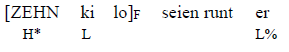 Unter Intonationskontur versteht man den Verlauf der Tonhöhe einer IP, i. e. die melodische Gestaltung einer Äußerung. Der wichtigste Melodieverlauf im Standarddeutschen ist dadurch gekennzeichnet, dass die Tonhöhe zunächst ansteigt, auf eine bestimmte Höhe verweilt und dann wieder absinkt. Tonhöhenveränderungen sind als Ergebnis eines Übergangs zu verstehen, der phonologisch unterschiedlich realisiert werden kann. Dabei spielt der tonale Kontrast zwischen Hochton (H) und Tiefton (L) in der Position des Akzenttons (mit einem * markiert) eine entscheidende Rolle, denn jeder Ton trägt eine feste abstrakte Bedeutung (cf. Duden 2016: 102f.):