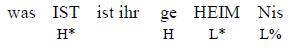 Im Deutschen zählen prosodische Merkmale neben der Konstituentenabfolge zu den Hauptkodierungsmitteln der Informationsstruktur (cf. Musan 2010). Informationsstrukturelle Kategorien lassen sich durch bestimmte Tonhöhenbewegungen kodieren und können somit voneinander unterschieden werden. Das spielt im Rezeptionsprozess für die Interpretation von einzelnen Informationsschritten, i. e. von kommunikativ abgeschlossenen Einheiten eine wesentliche Rolle. Ein einfaches Beispiel:2