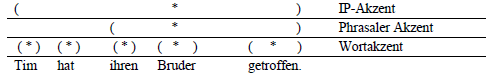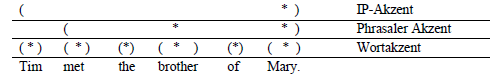 In den 70er Jahren versuchte man, diese generative Perspektive zur Akzentzuweisung auch auf das Deutsche zu übertragen (cf. hierzu Féry/Herbst 2004: 44). Dabei wurde aber klar, dass NSR nicht immer zu richtigen Vorhersagen führt und dass Deutsch und Englisch – trotz mancher Ähnlichkeit – bei der Akzentplatzierung unterschiedliche Kriterien heranziehen müssen. Ein wesentlicher Schwachpunkt für die Anwendung der NSR auf den deutschen Satz besteht z. B. darin, dass sie semantische Kategorien ausschließt und nur die oberflächliche Linearstruktur der syntaktischen Konstituenten berücksichtigt: