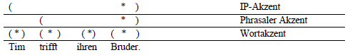 Auch andere Faktoren können die Zuweisung von Fokusakzenten und die Aufteilung von informationsstrukturellen Kategorien steuern. Unter Berücksichtigung von Kategorien wie Kasus und (Un)Definiertheit regelt z. B. die Morphosyntax die Reihenfolge der Konstituenten und bestimmt ihre Einbettungstiefe, wonach dann die prosodische Struktur festgelegt wird. Mit Bezug auf ditransitive Satzkonstruktionen fasst Büring (1997: 13) in Anlehnung an Lernerz (1977) diese Faktoren wie folgt zusammen: