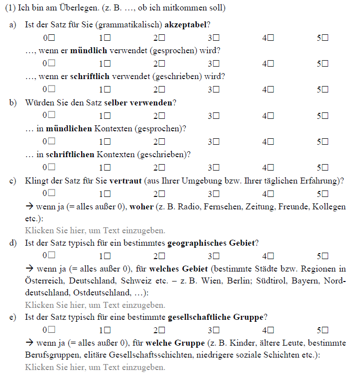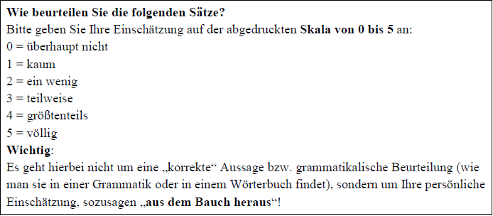 Der Fragebogen umfasste 23 Items7, die jeweils auf einer 6 stufigen Skala8 (von 0 „überhaupt nicht“ bis 5 „völlig“) nach ihrer (grammatikalischen) Akzeptabilität9 bewertet werden sollten. Im instruktiven Teil wurden die Informant:innen darauf hingewiesen, dass es um keine „korrekten“ Aussagen bzw. grammatikalischen Beurteilungen gehe, wie man sie in einer Grammatik oder einem Wörterbuch findet, sondern um eine persönliche Einschätzung, sozusagen „aus dem Bauch heraus“. Falls die Gewährspersonen in ihrem Alltag auch Dialekt oder Umgangssprache verwenden, sollte dies bei der Bewertung ebenso berücksichtigt werden.