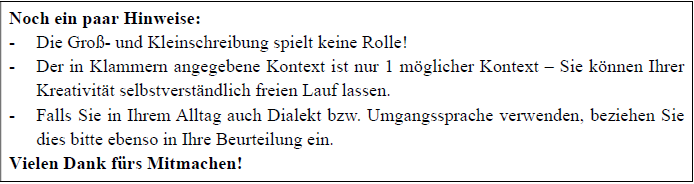 Da manche Strukturen vornehmlich auf den mündlichen bzw. schriftlichen Bereich beschränkt sein dürften (cf. z. B. Krause 2002: 87–92, aber auch Flick/Kuhmichel 2013: 60–64), wurde neben einem allgemeinen Akzeptabilitätsurteil auch eine getrennte Bewertung für mündliche vs. schriftliche Kontexte erhoben. Selbiges gilt auch in Bezug auf die eigene Verwendung der untersuchten Strukturen, wo nach einer allgemeinen Einschätzung gleichfalls eine Differenzierung in mündliche vs. schriftliche Kontexte erfolgte. Im Anschluss wurden des Weiteren Informationen hinsichtlich Vertrautheit sowie etwaiger diatopischer und diastratischer Markierung erfasst.