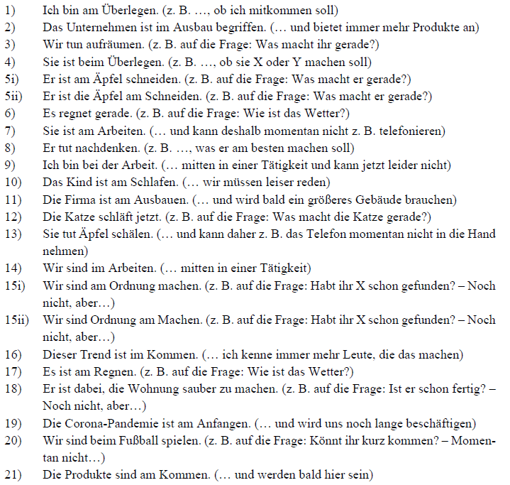 Abgesehen von den bereits diskutierten am und tun Periphrasen werden in der einschlägigen Literatur auch Periphrasen mit den jeweils mit dem bestimmten Artikel verschmolzenen Präpositionen bei (beim) und in (im) + Infinitiv + sein sowie die Konstruktion dabei sein zu + Infinitiv – ferner auch temporale Adverbien20 in Verbindung mit einer konjugierten Verbformzum Ausdruck von Progressivität im Deutschen angeführt (cf. u. a. Ebert 1996, 2000; Krause 1997, 2002; Flick/Kuhmichel 2013). Die Daten der vorliegenden Studie zeigen, dass sich auch in diesem Bereich Unterschiede in Bewertung und Gebrauch der jeweiligen Strukturen zwischen den drei untersuchten Sprachräumen abzeichnen.