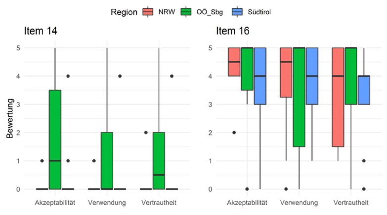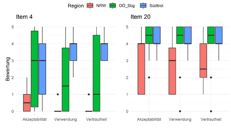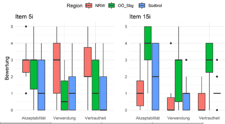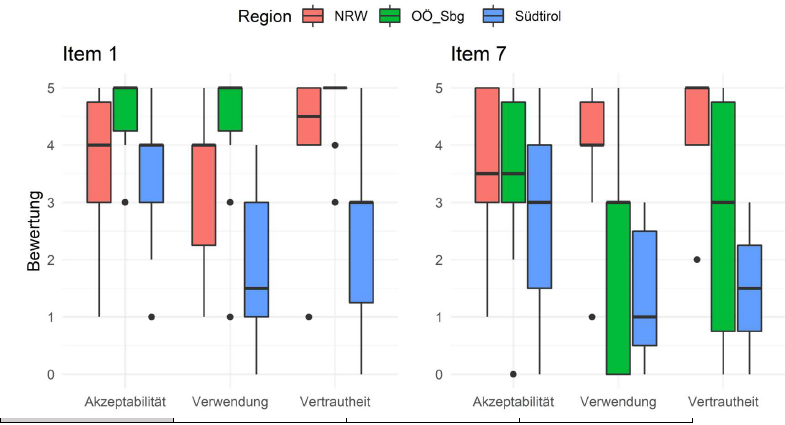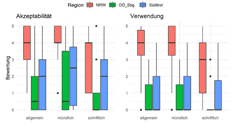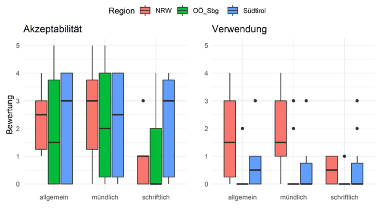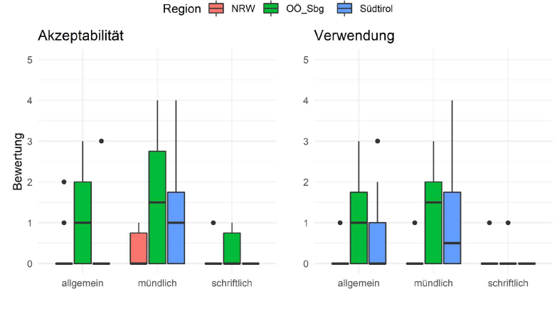 Die allgemeine Akzeptabilität von Item 1 ist in Südtirol, OÖ/Salzburg und NRW nahezu in allen Bereichen ähnlich, mit latent höheren Werten in OÖ/Salzburg. Im Schriftlichen sind für NRW hingegen die niedrigsten Werte zu verzeichnen (Votum 1 bis 3). Für das physische Aktivitätsverb arbeiten zeigen sich ebenfalls in allen Gebieten ähnliche Akzeptabilitätswerte.
