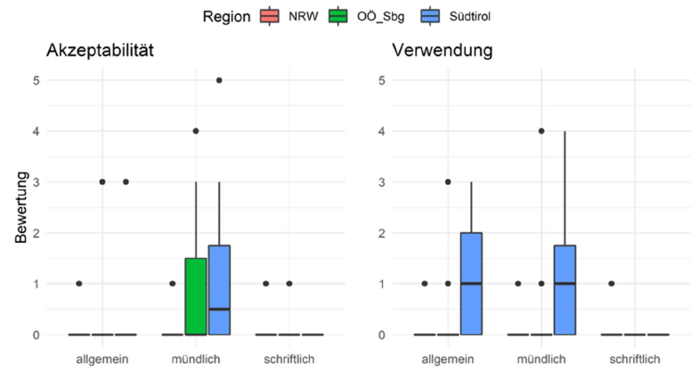 In der Gebrauchsdomäne setzen sich die Tendenzen der Niedrigbewertungen fort. Auch hier wurden in OÖ/Salzburg für Item 11 vergleichsweise höhere Werte erzielt als in den anderen Regionen. Große diamesische Unterschiede sind dabei kaum auszumachen. In NRW fiel die Ablehnung besonders stark aus: Jeweils sieben Befragte würden eine solche Konstruktion im allgemeinen und mündlichen Gebrauch niemals benutzen, im schriftlichen sogar neun. Bei Item 19 zeigt sich hinsichtlich der Verwendung im Gegensatz zu Item 11 ein noch klareres Bild: NRW sticht wiederholt mit der höchsten Anzahl an Nullbewertungen (jeweils neun in allen Bereichen) hervor, was eindeutig die Erwartungen für das Kerngebiet unterläuft.