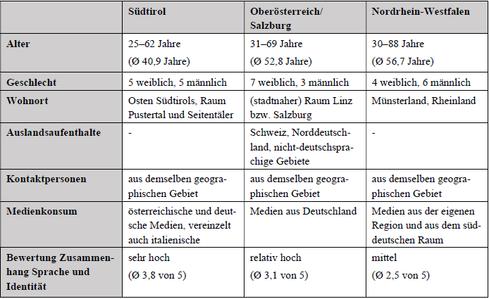 Mit dem Ziel, einige regionale Ausprägungen von Progressivität im Deutschen zu eruieren, wurden exemplarisch Daten aus drei dialektal unterschiedlichen Regionen des deutschen Sprachraums erhoben: Südtirol (Südbairisch), Oberösterreich/Salzburg (Mittelbairisch) und Nordrhein Westfalen (Rheinisch Westfälisch).5 Insgesamt wurden Daten von 30 Informant:innen (N = 30; 14 männlich, 16 weiblich) im Alter von 25 bis 88 Jahren (Durchschnitt 50,1 Jahre) gesammelt, je zehn pro definierter Region. Bei der Auswahl der Gewährspersonen wurde darauf geachtet, diese hinsichtlich Geschlecht, Alter und Beruf zu variieren. Die Erhebung der Daten erfolgte mittels Zusendung der entsprechenden Dokumente (Fragebogen und Sprachbiographie) per E-Mail, die ausgefüllt wieder an die Explorator:innen retourniert wurden. Neben einigen zentralen demographischen Daten beinhaltete die Sprachbiographie Informationen über Aufenthaltsort und dauer der Gewährspersonen (ggf. auch über längere Aufenthalte an anderen Orten), Auskunft über die Herkunft der Kontaktpersonen, etwaigen Medienkonsum aus anderen deutschsprachigen Regionen sowie die persönliche Einstellung zum Zusammenhang zwischen Sprache und Identität (da letzter die Bewertung und Verwendung bzw. Vermeidung bestimmter sprachlicher Konstruktionen ebenfalls maßgeblich beeinflussen kann). In der folgenden Tabelle sind die sprachbiographischen Daten der Informant:innen nach dialektalem Gebiet zusammen fassend dargestellt6: