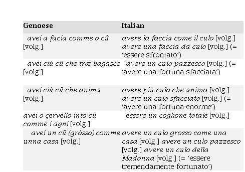 Sometimes, also different body parts are used as metaphors, such as in tegnî o naso into cû à qcn. [volg.] (lit. ‘to keep their nose into somebody’s ass’) / leccare il culo a qcn. [volg.] meaning ‘flattering sb.’ or ‘adapting to his every decision for personal benefit’ or in grattâse o cû [volg.] (lit. ‘scratching their own ass’) / non fare un cazzo [volg.], meaning ‘loafing when one should be engaged in some activity’ (e. g. at work). But their uses often match, such as in cacciâse a lengua into cû [volg.] (lit. ‘sticking your tongue in your ass’) / mettersi la lingua in culo [volg.], meaning ‘to be silent’ or ‘to shut up’, or avei a facia comme o cû [volg.] (lit. ‘to have a face as an ass’) or in avere una faccia da culo [volg.], meaning ‘to be cheeky’.