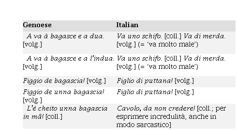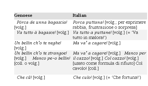 Among the communicative phrasemes, one can see that both Genoese or Italian may offer more variants. Genoese offers more in the following examples: Figgio de bagascia! [volg.] o Figgio de unna bagascia! [volg.] / Figlio di puttana! [volg.] and Un bellin ch’o te neghe! [volg.] o Un bellin ch’o te strangoe! [volg.] / Ma va’ a cagare! [volg.], while Italian offers more when comparing Manco pe-o bellin! [coll. o volg.] / Manco per il cazzo! [volg.], Col cazzo! [volg.] [usato come formula di rifiuto], Col cavolo! [coll.], although some have one kind of register and some another (compare “coll.” and “volg.”). However, several expressions also correspond 1:1, such as Che cû!.Che culo! and Va tutto à bagasce!.Va tutto a puttane!