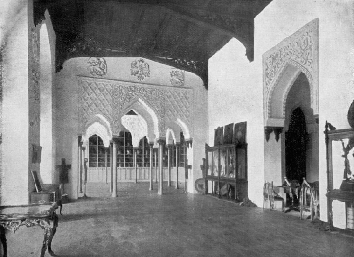 Datant du Moyen Âge, le palais de Kórnik est entièrement reconstruit dans les années 1843-1860, selon les plans de Tytus comte Działyński (1796-1861) lui-même, en coopération avec Marian Cybulski, sur la base des projets de Henryk Marconi, Antonio Corazzi (1892-1877) et Karl Friedrich Schinkel (1781-1841) (Kąsinowska). Le nouveau « costume » néo-gothique correspond à la vocation patriotique de la résidence, conçue comme le cadre pour les collections familiales, dédiées à l’histoire et la gloire de la nation. Il est enrichi, dans la partie centrale du palais, par des éléments mauresques. En effet, l’intérieur de la Grande Salle, destinée à la bibliothèque, est fidèlement calqué sur le schéma architectural et les décorations de la Cour des Lions et de la Cour de Myrtes de l’Alhambra (Whelan ; fig. 3). Les seules exceptions à cette règle, les parties supérieures des murs, sont décorées des armoiries de l’ancienne République de Deux Nations (polono- lituanienne).