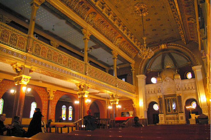 Au courant mauresque – ou « néo-mauresque » selon la terminologie de l’époque – appartiennent aussi de nombreuses synagogues d’Europe centrale et orientale, construites tout au long de la deuxième moitié du XIXe et au début du XXe siècle12. Parmi les exemples polonais les plus connus on peut citer les synagogues de Łódź, ville de la grande bourgeoisie juive : la grande synagogue (« réformée »), bâtie entre 1880 et 1887 par Adolf Wollf, architecte des temples de Stuttgart et Carlsbad, dont les plans furent officiellement signés par Hilary Majewski, l’architecte de la ville, et la vieille synagogue, rénovée par Adolf Zeligson dans les années 1897-1899 – toutes les deux détruites13. La décoration intérieure la plus spectaculaire, et la mieux conservée, est celle de la synagogue Tempel de Cracovie (synagogue « réformée » construite par Ignacy Hercock en 1860-1862), réalisée par Beniamin Torbe dans les années 1893-1894, avec un ensemble des vitraux aux motifs géométriques orientalisants, unique dans leur genre (Rejduch-Samkowa et Lewicka- Depta 27-31 ; fig. 4)14. Au même groupe appartiennent aussi des tombeaux de personnalités juives, comme Levi Lesser (1884) ou Jakub Eiger (1888) au cimetière de Varsovie. Parmi les synagogues érigées dans les années 1900, conçues par les architectes qui n’étaient pas liés aux milieux juifs, on peut rappeler ici la nouvelle synagogue de Tarnów de Władysław Ekielski, érigée entre 1900 et 1908, et la synagogue de Kielce de Stanisław Szpakowski, bâtie entre 1901 et 1909 (toutes deux détruites), ou encore l’hôpital juif de la Fondation de Maurycy Lazarus, de Kazimierz Mokłowski à Lwów, qui date des années 1898-1903, les trois bâtiments combinant des éléments mauresques et turcs.