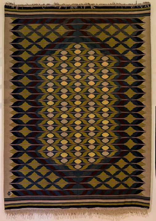 Mais c’est dans les kilims qu’elle trouve sa meilleure expression. La grande échelle de l’ornement, le nombre restraint des couleurs soigneusement sélectionnées et une composition compacte : telles sont les traits caractéristiques des kilims de Kazimierz Brzozowski (1871-1945), Karol Tichy (1871-1939) ou Józef Czajkowski (1872-1947 ; fig. 8). Mais leur qualité visuelle la plus frappante est une certaine « logique » décorative qui permet d’intégrer des éléments nouveaux dans une structure – un schéma de composition – traditionnelle. Hybridation réussie des modèles orientaux et des productions traditionnelles polono-ukrainiennes, ils deviendront d’une certaine façon la marque distinctive de la nouvelle école décorative polonaise (Warchałowski 32).