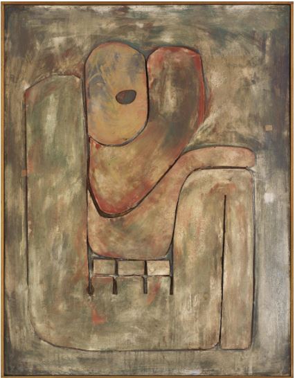 This imposing work with an outstanding conception consists of a system of wooden bas-reliefs with an architectural stature that allows the letters of the word “AL SHARIDA” to be arranged like a dismembered body or a couple whose bodies are entwined (or sitting on each other), as Abdalla often suggested in many of his works (fig.2). Al Sharida is a fine example of this research into the hybrid and the third sense, beyond the visual form and the form of language. It is even more evident here since the wandering or sleep of the spirit refers to what we do as readers/interpreters looking at the painting: we recognize the word written out “in full” while letting ourselves wander through untold, unpredictable ramifications, as if the moment when we read the word and the moment when it escapes us (the moment when the letters seem to let go of each other or break free of their own meaning) were basically the same. For Abdalla, the only meaning is nomadic, like human nomadism, beginning with his own discontinuous journey across Africa and Europe. Al Sharida dates from 1966, when the artist left Denmark for France, a turning point marked by the return to forms even more ingrained in Egyptian and Arabic identity. Edourad El Kharrat, in a remarkable text on Abdalla, was the first to speak about them as “Arabic hieroglyphics”, observing with keen insight the “expressionist treatment of Lettrism…the dynamics of the letters, their inner movement and the incessant waves of their exuberance”.10