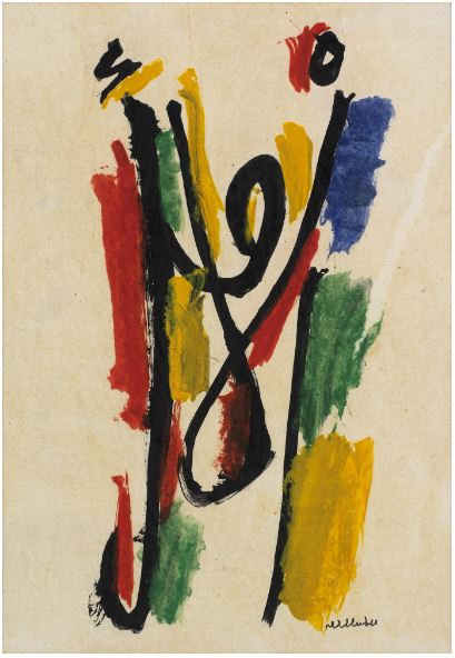 Amongst the collection of symbols invented by Abdalla is an exact double of the prostrate figure: the figure of the fellah, the peasant whose freedom is attached to his land yet threatened by the expropriation of that land. Abdalla started using this figure in the Egyptian years (the 1940s). With his arms thrown up in the air, like a letter seeking its destination, or, more precisely, the crescent of the character lam-alif stretching up towards its silent accent, Abdalla’s fellah is a symbol of resistance, revolt, insurrection – he is like the closed fist of the prostrate body, which suddenly opens. Again, language and image are never completely separated; they come together in the search for a third space, an area of recognition of symbols not identified by purely encyclopedic knowledge. Abdalla’s language is inspired by the architecture, calligraphy and miniatures of the so-called Islamic tradition as well as by Persian, Chinese, African and European modernism, which he first confronted, almost without realizing it, in the 1940s. Above all, however, to completely free himself of distinctions between abstract and figurative, geometrics and symbolism, he takes even more liberties in layering the painting space and the writing space, i.e., the space of projection and of inscription.