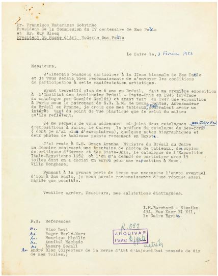 Vous avez été notre collaboratrice directe, lors de notre seconde biennale, et nous avez offert si gentiment votre appui par vos démarches et relations dans les cercles artistiques de votre pays. C’est la raison pour laquelle nous nous permettons de nous adresser encore une fois à vous, pour faire appel à votre amabilité, certains comme nous le sommes que les éléments que vous pourrez nous fournir nous seront de la plus grande utilité en faveur de la présence de l’Égypte à notre prochaine manifestation »51.