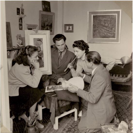 L’intervention de Burchard se révèle alors providentielle. Bénéficiant d’une solide expérience d’organisation d’expositions, elle réunit rapidement un groupe d’artistes désireux·ses de participer à la Biennale. Comme elle l’explique dans une lettre du 16 avril 1953, « La liste des inscriptions comprend actuellement 22 artistes appartenant au groupement de ‘l’Atelier’, 54 rue Fouad Ier, Alexandrie, et aux groupements des ‘Amis de l’Art’, de ‘l’Art Contemporain Égyptien’, etc… »16. Le rôle exact des organismes cités n’est pas connu, sinon qu’ils semblent avoir contribué à la coordination. Parmi eux, figure donc la Société des Amis de l’Art initialement contactée par la Biennale, et avec laquelle Burchard est en relation directe puisqu’elle expose au mois de mai 1953 ses tableaux chez Madeleine Francine Biberia, une amatrice d’art mondaine alors secrétaire de la Société (fig.3). Quant à l’Atelier d’Alexandrie, association culturelle fondée en 1934 par le peintre Mohamed Naghi (1888-1956) et l’écrivain Gaston Zananiri (1904-1996) pour promouvoir la production artistique et littéraire, son secrétaire général Giuseppe Sebasti (1900-1961) se charge de transmettre à Profili les fiches d’inscription de plusieurs de ses membres : Clea Badaro (1913-1968), Effat Naghi (1905-1994), Oscar Terni (1900-?), et Gaby Cremisi (1912-1987)17. Son envoi est daté du mois d’avril, alors que Burchard se trouve précisément à Alexandrie où elle participe à l’exposition « 4 Peintres du Caire » aux Amitiés Françaises, aux côtés d’Inji Efflatoun, Kamal Youssef (né en 1923) et Hamed Nada (1924-1990) (fig.4).