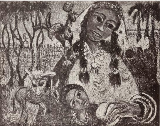 Les archives et le catalogue, qui n’inclut ni introduction ni images, ne permettent pas d’identifier facilement les œuvres exposées malgré leur titre. Le Musée d’art moderne de São Paulo (MAM-SP) conserve cependant un témoignage matériel de la présence égyptienne en 1953, puisque Carlos Suares a fait don de l’un de ses tableaux qui porte le titre opportun de São Paulo (non daté)39. Celuici fait partie d’un accrochage des collections permanentes du musée en 1954-1955, qui compte aussi un tableau de Burchard, classé parmi les donations suite à un malentendu avant d’être restitué à son autrice40. Intitulé Sous le ciel de Paris, on sait que ce tableau figure dans la sélection égyptienne. Le catalogue mentionne trois autres œuvres de Burchard : La Crèche de Saint-Roch, La Fiancée de Sidi Mobarek et Fellaha de Sawagui (fig. 5).