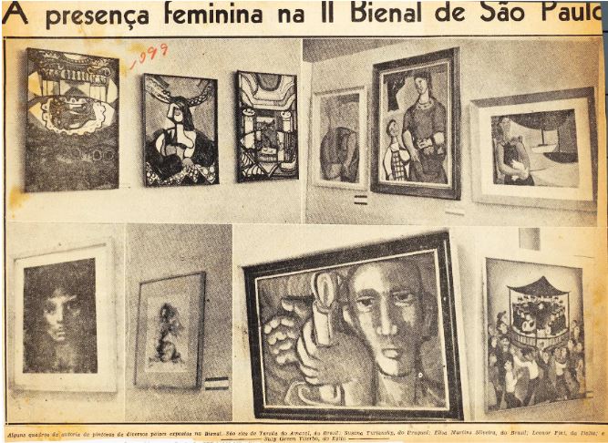La délégation égyptienne n’est pas seulement emmenée par une femme, elle comprend aussi un tiers de femmes parmi les artistes exposé.e.s, soit 9 femmes sur les 27 artistes. Ce chiffre, encore aujourd’hui rarement atteint dans les expositions collectives d’envergure internationale, place l’Égypte parmi les pays qui valorisent alors le mieux les femmes dans leur délégation. En effet, la plupart des nations participantes expose moins de trois femmes. Plusieurs d’entre elles n’en incluent même aucune comme la Suisse, l'Allemagne, l’Espagne et Israël. Leonor Fini est la seule de son genre parmi les 31 artistes de la section italienne. Les pays d’Amérique latine semblent plus favorables à la mixité, en particulier le Chili mais aussi le Brésil qui présente près d’un tiers d’artistes femmes. Celles-ci sont mentionnées dans une brève du journal brésilien A Gazeta qui titre « La présence féminine à la IIème Biennale de São Paulo » (fig. 7) et s’illustre de quelques images de tableaux peints par des femmes48. Parmi elles, Suzy Green Viterbo est mise en lumière, rare écho de la participation égyptienne dans la presse locale. Seulement, l’image publiée sous son nom n’est pas d’elle mais de son confrère Samir Rafi, puisqu’il s’agit de L’Homme à la chandelle (1951).