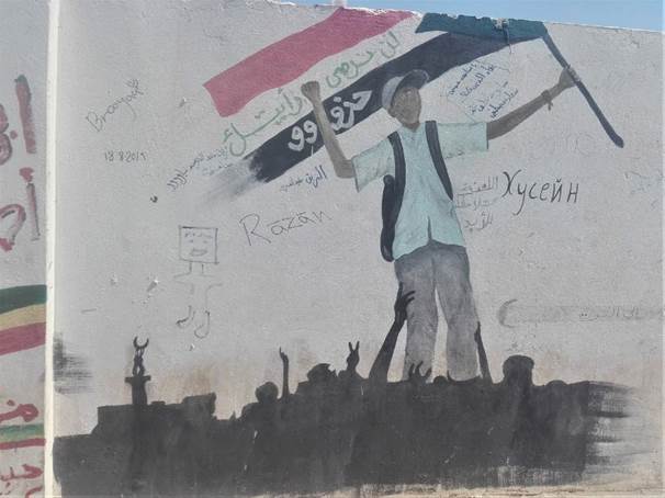Nous avons fait comme une réunion, avant de commencer le sujet de la grande jidariyya des martyrs, j’avais cette idée avant le sit-in. . . mais je savais pas où la faire. Et donc, quand nous nous sommes rassemblés dans Al-Qiyada. . . nous avons fait une réunion pour savoir d’où nous allions ramener les matériaux. Nous nous sommes alors divisés en groupes, un groupe est allé chercher l’endroit où nous pourrions la dessiner, nous nous avons fait des croquis. . . puis nous avons eu l’idée de les dessiner aux couleurs de l’ancien drapeau, comme ça toi tu vois l’ancien drapeau, mais comme avec des pixels, et chaque pixel, ce sera en fait le visage d’un martyr. Après ça, nous avons préparé les couleurs. . . et les gens voulaient participer, et par exemple, y en a qui voulaient aider, mais ils savent pas dessiner, alors ils ramènent les couleurs, ils ramènent la peinture, ils ramènent l’enduit, ils donnent de l’argent pour que nous puissions acheter ce dont nous avons besoin (Waqas)