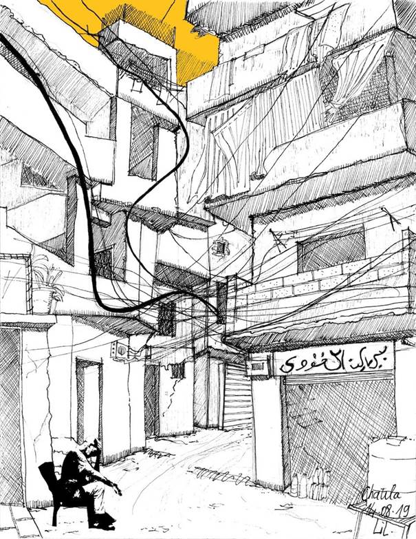 Il est 12h48, le soleil culmine. Le bitume réverbère la lumière. Je plisse les yeux pour contempler le spectacle d’enfants qui s’adonnent à leurs activités journalières dans la cour. Ils courent sans cesse, tombent parfois sur le sol rugueux et s’égratignent les genoux. Certains s’amusent à lancer des billes dans les innombrables cavités de la chape bétonnée. Leurs cris résonnent dans les maisonnées alentours. Cette cour, aussi bruyante et vivante qu’elle soit, m’apparaît jusqu’à aujourd’hui comme un havre de paix au milieu d’un agglutinement de baraques qui rivalisent pour gagner en superficie. Les logis se montent dessus, s’accolent, se dévisagent pour un semblant d’existence. On ne la nomme pas ; on y débouche après s’être perdu mille et une fois dans un amas de logis qui forment des allées sombres et exiguës. Ce condensé architectural forme le camp de réfugiés de Chatila. Assise sur une échelle entreposée au sol, j’ébauche ma première esquisse de cette cour après avoir passé des heures à tenter de la retrouver. Des enfants m’approchent, et ces quelques lignes maladroites initient un premier échange que les mots ne permettent pas.
