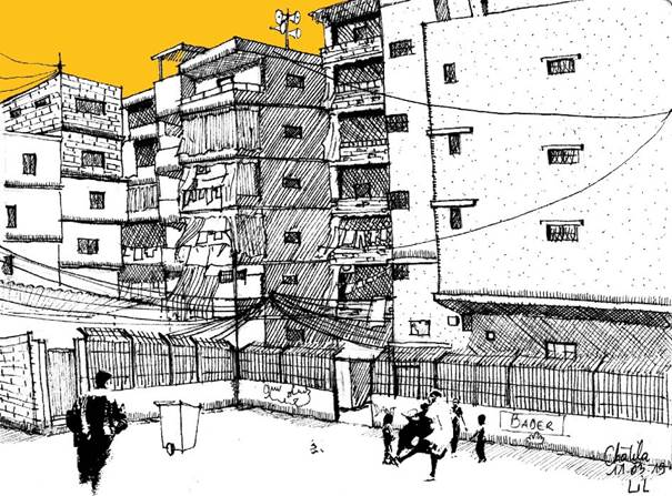 Je collectionne des esquisses de ces façades sur des feuilles volantes. Je dessine au crayon, je sais que tout s’efface, que je peux recommencer et la peur s’échappe. Le papier absorbe la curiosité des gamins et l’empreinte de leurs mains lorsqu’ils pointent du doigt la nuée de lignes qui représente un lieu familier. Je passe des heures entières à tenter de sauvegarder cet endroit dans mon esprit et sur un bout de papier, au cas où je déciderais de ne plus y remettre les pieds. Je ne l’ai toujours pas quitté. Ces dessins sont aujourd’hui comme un laissez-passer, une porte d’entrée sur ce lieu que l’on ne connaît que de nom. Ils m’ont permis parfois de retrouver mon chemin au milieu d’un labyrinthe sans issue où le regard seul se perd, tandis que la ligne sur la feuille reste. Ils adoucissent les plus méfiants, dérident les visages dubitatifs. J’affûte mon regard, tout en illustrant une réalité sur laquelle on ferme les yeux.