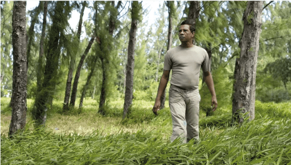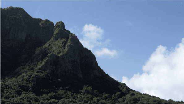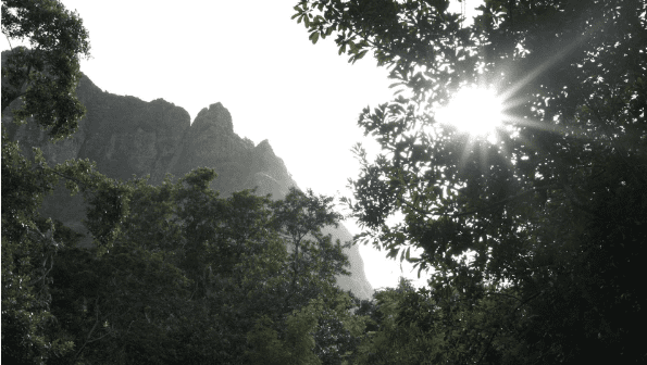 Le film s’ouvre sur la montagne du Morne qui renvoie dans l’imaginaire collectif mauricien à un lieu mythique (photogrammes 2, 3 et 4). La légende raconte que des centaines d’esclaves marrons y auraient trouvé refuge, mais que, pris en embuscade par leurs anciens maîtres, se seraient jetés du haut des cimes pour leur échapper, choisissant la libération par la mort à l’as- servissement.