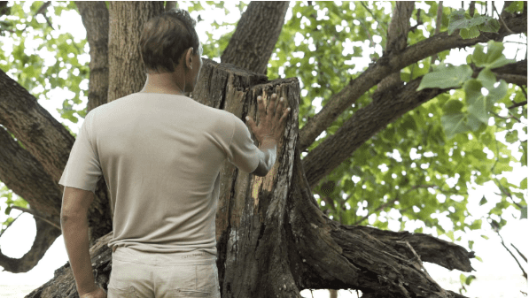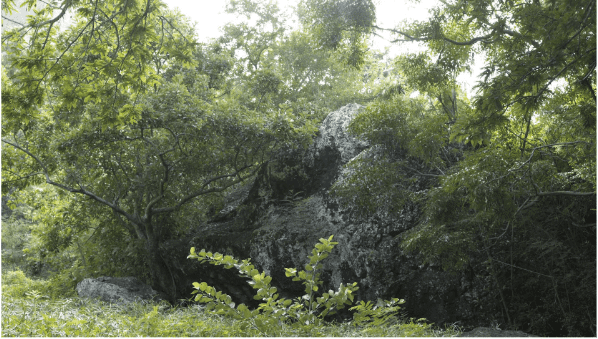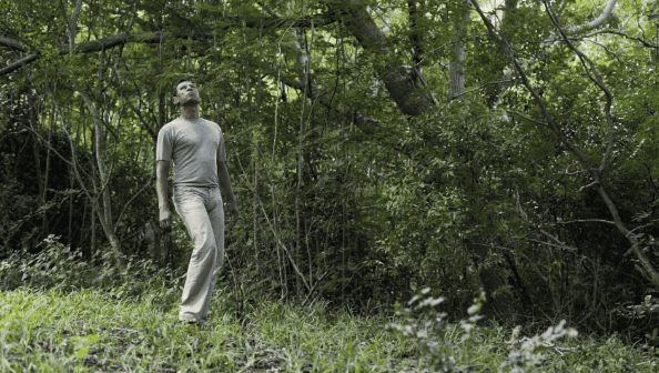D’abord au pied de cette montagne, le danseur poursuit ensuite sa déambulation dans les chemins boisés et de manière simultanée, dans les chemins d’un cimetière (photogrammes 5, 6 et 7). Les paysages du cimetière ont été envisagés comme un envers symbolique, topo- graphique et intime de la montagne du Morne. Symbolique, car les rites mortuaires du catholicisme ont été imposés puis pratiqués par les descendants d’esclaves ; topographique, car le cimetière ici filmé – celui de St Georges à Port-Louis ; intime, car ce cimetière abrite les tombes de membres de ma propre famille. Comme une errance entre les mondes, le danseur arpente tantôt ce cimetière peuplé de croix, tantôt ce bois rempli d’arbres aux allures de tombes. Il entend le bruit du vent et des vagues, et continue sa marche vers une croix. Il la touche, et au même moment, touche aussi un tronc d’arbre (photogrammes 8 et 9). Face à lui, une lumière éblouissante le conduit à une embouchure. Il s’accroupit, procède à quelques ablutions, les mains dans l’eau (photogrammes 10 et 11). De là, allongé sur une plage, les yeux clos, il s’éveille dans une arrière-cour, au milieu d’une nuit sombre (photogramme 12). Puis, accroché du regard par un petit autel situé au pied d’un arbre à tamarins, il se lève et entame une danse circulaire (photogrammes 13 à 15). Cette arrière-cour est le lieu des offrandes. Historiquement, cet espace renvoie à l’imaginaire spatial des ségas qui se dansaient dans les arrière-cours, en marge des lieux officiels. Mais il dit aussi quelque chose de l’intime : cette cour, cet autel appartiennent à ma famille. Ils exécutaient des rituels et faisaient des offrandes au pied du tamarinier, tout comme la danse de Jean-Renat Anamah qui s’offre à ces mêmes ancêtres.