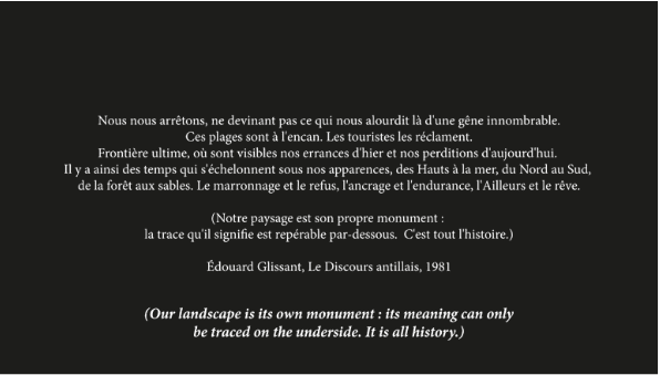 Le point de départ de mon film était celui d’une recherche consciente à éviter tout soupçon d’un regard exotique. Voulant m’extraire de ce regard supérieur et assuré de sa supériorité, celui qui se pose sur les corps noirs et qui perçoit ces corps comme des territoires à conquérir, à nommer et à encadrer, j’ai expérimenté une narration et une dramaturgie qui privilégiaient la fluidité. Landslides met en scène des paysages-mémoires qui ne se laissent pas tout à fait encadrer3. Entre plans-larges et gros-plans, les paysages apparaissent à la façon d’une mémoire, par soubresauts, retours, répétitions et glissements. Les paysages filmés, convoqués comme on convoque des esprits, sont traversés par un danseur qui les relie les uns aux autres. Ils s’articulent en strates successives pour assembler des mémoires du séga qui se conjuguent avec des souvenirs de ma propre histoire. Mais ce cheminement, engagé par le danseur, ne fait pas remonter le temps. Il permet davantage de mettre à jour une sédimentation de temporalités. Ces paysages contemporains révèlent différentes traces, qui auraient toutes la même matrice historique, celle de la blessure esclavagiste. Ainsi, le film s’ouvre sur une citation du philosophe Édouard Glissant qui illustre cette intention de considérer les paysages d’aujourd’hui comme des entités animistes capables de témoigner sur le passé esclavagiste (photogramme 1).