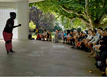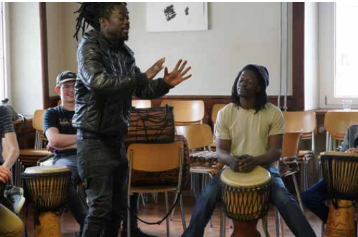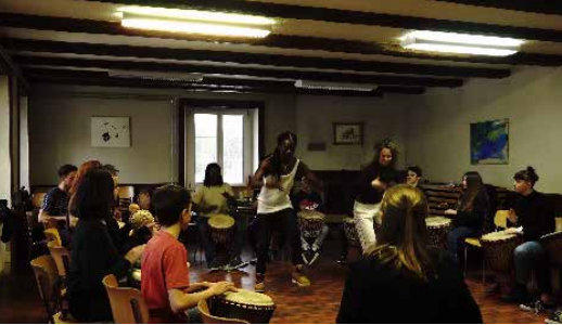potential of artistic creation as a space for intercultural exchange, art becoming a buffer zone between cultures (Enwezor 2012). Music students learned to play the djembe, discovering the diversity and complexity of the drum’s rhythms. Through the encounter with Dédou, a Burkinabe musician, and André, a Senegalese dancer, these Swiss teenagers faced “the exotic faraway” – most of them for the first time.