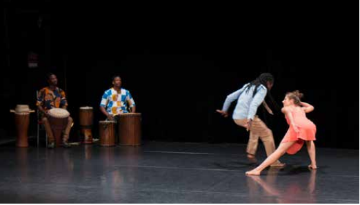 Together with André, we applied small strategies, hoping to distort the exoticism of “African” folklore and the image of “African” imaginary enclosed in a “traditional Africanism” (the stereotyped vision of a generalized Africa embedded in savanna, forest, village in great harmony with nature) (Chrétien 2007, 167): for instance, by wearing western costumes rather than traditional “boubou”, inserting ballet movements and floor work sequences between Dudumba and Soko steps. In addition, we proposed to debate with the audience at the end of our performances, to share our reflection on the production process and the “modernity” of “African dances” – a category criticized for its generalizations and association with the village (Cooper Albright 1997; Lassibille 2004; Tiérou 2001). We also created a short video essay out of our performance to transmit some of our theoretical questions (Vioram et al. 2021). For a next version, we also wish to have a DJ on stage to counterbalance the image generated by the two drummers, Ibou und Abou.