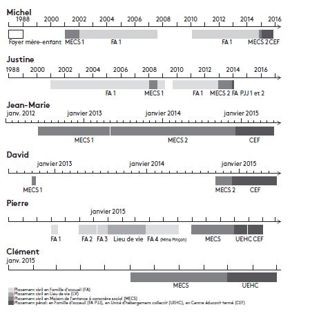 Quand la MECS intervient en amont (pour Michel) ou en cours (pour Justine) de placements familiaux, elle remplit la fonction d’accueil provisoire le temps de trouver une famille d’accueil ou d’hébergement temporaire pour soulager l’assistant·e familial·e un ou plusieurs mois. Les six parcours ont en commun de se terminer par un placement en MECS à partir duquel démarre le parcours pénal (en famille d’accueil PJJ, en unité éducative d’hébergement collectif – UEHC – ou en centre éducatif fermé – CEF).