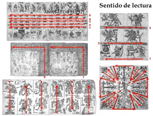 Los códices nahuas se leen generalmente de abajo hacia arriba. Pero también hay códices que se leen en zigzag, de derecha a izquierda, del centro hacia afuera o de arriba hacia abajo. Los documentos están rodeados por un margen de glifos calendáricos, cuya lectura es independiente de la distribución del texto central.