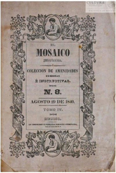 El Mosaico mexicano O colección de amenidades curiosas e instructivas. México: Isidro Rafael Gondra, Ignacio Cumplido, 1836-1842. T. 1, no. 1-12 (lo. oct. 1836 - 15 mar. 1837); 512 p. T. 2 (1837); 512 p. T. 3 (1840); 548 p. T. 4 (1840); 586 p. T. 5 (1841); 619 p. T. 6 (1841); 618 p. T. 7 (1842); 608 p. (Imp. por Ignacio Cumplido). Il..; 24 x 15 cm. índices, lista de suscriptores, planos, litografías, partituras. De octubre de 1836 al 15 de marzo de 1837 la frecuencia de la revista fue quincenal, sin embargo, según indican el Diccionario Porrúa y Guillermo Prieto, de 1840 a 1842 fue semanal53. Existen reimpresiones de los tomos 1 y 2 que presentan diferencias con la primera edición en el contenido literario, las ilustraciones y paginación, pero conservan el mismo título y ambos fueron impresos y publicados por Ignacio Cumplido en México. De acuerdo con una nota de la publicación sabemos que sufrió una suspensión en septiembre de 1837 a causa de la guerra de Texas y que el número 1 del tercer tomo aparecería el 15 de enero de 1840. La foliación de cada tomo es progresiva, con páginas impresas a renglón corrido y a 2 columnas. A partir del tomo 2 la numeración desapareció, por lo que no hay evidencia de las entregas que tuvo. Algunas fuentes como el Diccionario Porrúa y María del Carmen Ruiz Castañeda mencionan la existencia de dos épocas claramente diferenciadas y agregan que El Mosaico fue continuado por El Museo mexicano (1843-1846)54.