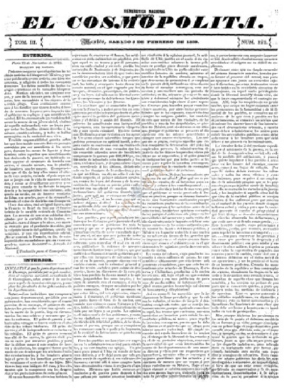 El Cosmopolita (c) México: [Manuel Gómez Pedraza[, 1836-1843. T. 1, no. 61 (13 jul. 1836). T. 3, no. 1-141 (9 dic. 1837 - 13 abr. 1839). T. 4, no. 1-144 (7 ago. 1839 - 30 dic. 1840). T. 5, no. 1-255 (2 ene. 1841 - 8 jul. 1843). (Imp. por Dionisio Martínez, 1836; imp. por Ignacio Cumplido, 1837, e Ignacio Ávila, 1838; Imp. de Ignacio Ávila dirigida por Ignacio González, 1839; Imp. dirigida por Juan Sida, 1840; imp. por José Ignacio Martínez, 1841, y José María Jiménez, 1842; Imp. del Cosmopolita, 1843). 31 x 21 cm. (1836); 43 x 30 cm. (1837-1840); 42 x 30 cm. (1841-1843). Alcance y suplementos. Publicación bisemanal, aparecía los miércoles y sábados. Cada ejemplar constó generalmente de 4 páginas (algunos alcanzaron diez) con numeración independiente, impresas a 3 y 4 columnas. Como material complementario incluye doce suplementos y un alcance, además de un escrito sobre la defensa de Cumplido con motivo de su prisión. La dirección del primer impresor era calle de las Escalerillas, junto al número13; luego cambió a calle de la Cazuela número 1. De enero de 1838 a mayo de 1841 se imprimió en la calle de los Rebeldes número 2, Cazuela número 1 y Coliseo Viejo número 14; de junio de 1841 a junio de 1842 en la calle de Donceles número 21, y finalmente se imprimió en el número 18 de la misma calle. Por otra parte, la publicación cambió constantemente de impresores, pues además de Dionisio Martínez (1836) e Ignacio Cumplido (9 dic. 1837 - 3 ene. 1838) tuvieron a su cargo la impresión: Ignacio Ávila (6 ene. 1838 - 27 feb. 1839; 11 jun. 1842 - 6 mayo 1843); Ignacio González (2 mar. - 13 abr. 1839); Carlos Manzanedo (7 - 14 ago. 1839); Octaviano Soto (17 ago. - 21 sept. 1839; 11 ene. - 11 nov. 1840); Gerónimo Ávila (25 sept. 1839 - 8 ene. 1840); Juan Sida (14 nov. 1840 - 8 mayo 1841); José Ignacio Martínez (12 mayo 1841 - 26 ene. 1842); José María Jiménez (29 ene. - 8 jun. 1842) y J. del Castillo (11 mayo 8 jul. 1843). En 1836 recibía suscripciones José María Solís a razón de 6 reales por nueve números en la capital y 8 reales, francas de porte, en otras localidades; posteriormente, la suscripción mensual cambio a 12 reales en la capital y 14 reales franca de porte en el resto del país; los números sueltos costaban 1 real y medio. Las suscripciones se recibían en la imprenta y los números sueltos se vendían en la alacena de don Antonio de la Torre, esquina de los Portales de Mercaderes y Agustinos. En el único ejemplar que se conserva de 1836 (t. 1, no. 61) encontramos el siguiente epígrafe: "Commune periculum concordia propulsatur" (Agrícola); «Cuando todos peligran, la unión los salva». Según las obras consultadas, el general de caballería y ex-presidente de la República Manuel Gómez Pedraza fue co-propietario, editor y redactor responsable del periódico, en colaboración con el pedagogo Juan Rodríguez Puebla, rector del Colegio de San Gregorio. Publicó comunicados de José María Tornel, artículos de los redactores y de Francisco Modesto de Olaguibel, al igual que numerosas reproducciones de periódicos extranjeros y nacionales como The Globe, The Weekly Herald, Le Courrier des Etats-Unis, El Eco, El Diario y El Censor. Contiene anuncios de sastrerías, bancos, otras publicaciones, sobre rentas, venta de animales y propiedades, avisos a los lectores y al final anuncia también la venta de su propia imprenta. Periódico político de tendencia federalista que se pronunció por el regreso a la Constitución de 1824 y propuso "Que se adoptara un medio y no un extremo, para que no fuera a perderse todo". Publicó regularmente las secciones de Interior, Exterior, Comunicados y Avisos, además del editorial, titulado El Cosmopolita, en donde se analizaron cuestiones referentes al centralismo, al federalismo, a los departamentos y todo lo relacionado con la organización del Estado. Contiene asimismo noticias nacionales y extranjeras sobre aspectos diplomáticos, decretos y medidas adoptadas por diferentes gobiernos; reprodujo las sesiones de la junta Legislativa de 1843 y publicó una reflexión de los editores sobre la costosa manutención del ejército: los procuradores de la nación deberían escoger entre velar por los intereses del pueblo mexicano y fortalecer otros ramos de la administración o tener un ejército con gastos superiores a la producción de las rentas nacionales. Destaca también el artículo titulado "El general Tornel, -varios españoles,- los editores de la Hesperia" (9 dic. 1840), que trata sobre la polémica desatada por un folleto de don José María Gutiérrez de Estrada en el cual califica a Tornel de ser "enemigo del nombre español". Por otro lado, el número 141 (13 abr. 1839) tiene 4 páginas, pero sólo presenta 3 columnas impresas en la primera y el pie de imprenta en la cuarta; contiene el bando del gobernador constitucional del departamento de México, Luis Gonzaga Vieyra, que decretó la persecución y aprehensión de autores y cómplices de periódicos como El Cosmopolita, El Restaurador y El Voto nacional por fomentar la anarquía y la subversión. María del Carmen Ruiz Castañeda menciona que El Cosmopolita, El Mono y otros periódicos fueron acusados de subversión por el decreto del 8 de abril de 1839, que acabó con la libertad de prensa59. Finalmente, el número 255 contiene la despedida (p. 4), en donde se consigna que "desaparece con tranquilidad y ve con gusto [...[ que nadie podrá acusarlo por ganar época, ni por especulación, ni por aspirar a ceñir un laurel". El Catálogo de la Colección Lafragua menciona que el primer número de El Cosmopolita apareció el 16 de diciembre de 1835, fecha que se confirma con los datos que reporta Steven Charno en su catálogo y con los consignados en La Sociedad (vid. Bib Mex)60.