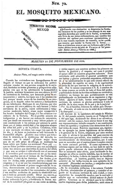 El 14 de marzo de 1834 nace el Mosquito Mexicano para apoyar a Santa Anna y combatir la prensa liberal. Desde sus orígenes está en contra de la secularización de la sociedad y de las leyes reformistas. En él se publica las bases de Tacubaya y el Plan de Iguala.