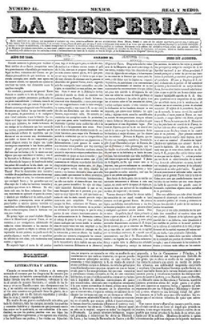 La publicación reprodujo trabajo de Manuel Bretón de los Herreros, Antonio Gil de Zárate, Ángel de Saavedra (duque de Rivas) y José Zorrilla; comunicados de Anastasio Bustamante y Arnaiz. Además, contó con colaboraciones y escritos de Anselmo de la Portilla, José Gómez de la Cortina y Manuel Barbachano y Tarrazo, quien firmó sus artículos con el seudónimo "Arach Noabb". Contiene avisos sobre venta de caballos, sastrería francesa, servicio de baños públicos, salidas de diligencias, anuncios de teatro y diversiones públicas. Hesperia es el nombre con el cual los romanos identificaban a lo que hoy es España; esta publicación fue creada para defender los intereses de los españoles radicados en México.