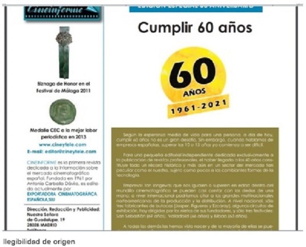 CINEINFORME, año de nacimiento 1961, 977 números publicados hasta agosto de 2021: sesenta años de historia del cine español y mundial recaen sobre las páginas de la revista cinematográfica española decana de las publicaciones periódicas especializadas. Una historia viva en torno a la producción, la distribución, la exhibición y las industrias técnicas cinematográficas. Una serie de notas caracterizan la existencia, evolución y perspectivas presentes y futuras de Cineinforme, como medio de comunicación impreso por excelencia de nuestro cine.