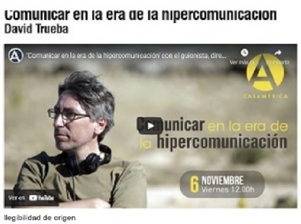 El primero de ellos consistente en una clase magistral del conocido y prestigioso guionista, director y escritor David Trueba sobre el tema Comunicar en la era de la hipercomunicación. Y el segundo, organizado por el Diario.es en colaboración con Casa de América y Mdif. II Encuentro de Periodismo Iberoamericano: los retos de informar en pandemia con el que se pretende conversar con medios españoles y latinoamericanos sobre dichos retos informativos. elDiario.es es un medio de comunicación digital independiente con sede en España fundado en 2012 por Ignacio Escolar, que sólo se financia con publicidad y una comunidad de socios. (Casa de América, 2020).