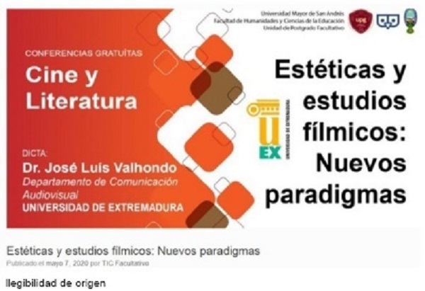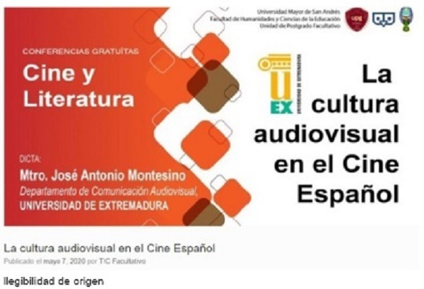 Y desde la Facultad de Humanidades y Ciencias de la Educación (Universidad Mayor de San Andrés-UMSA-Bolivia/La Paz) por Juan Antonio Gómez El cine como fenómeno de este tiempo 29 abril 2020, José Antonio Montesinos La cultura audiovisual en el cine español 7 mayo 2020, y José Luis Valhondo-Crego Estéticas y estudios fílmicos: Nuevos paradigmas 7 mayo 2020 (Gómez, 2020; UMSA, 2020).