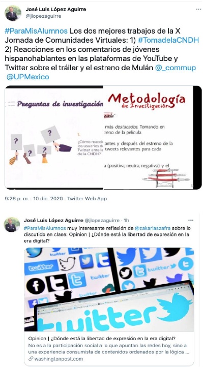 Esta red sociodigital es otra pieza multifuncional de Conectados +. Además de utilizar mi cuenta @jlopezaguirre como tablero de avisos y ejercer curaduría de contenidos mediante el hashtag #ParaMisAlumnos, buscamos especialmente animar entre nuestros estudiantes el análisis y la deliberación en torno a temas actuales y contenidos del Seminario.