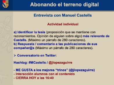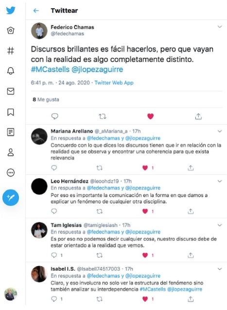 En la imagen 12 se muestran las indicaciones del Conversatorio basado en una entrevista videograbada con el Dr. Manuel Castells. Primero utilizamos Zoom y posteriormente migramos a Twitter. La dinámica21 duró 70 minutos. En promedio los alumnos publicaron cuatro tweets: uno o dos tweets sobre ideas relevantes de Castells (no se valía repetir la misma idea) y posteriormente uno a tres tweets que comentaban los tweets de sus compañeros (la solicitud fue comentar especialmente los tweets de los compañeros que no conocían).