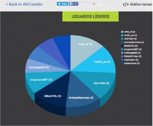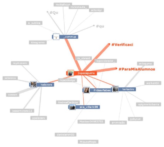 Seguramente, se preguntarán los lectores cómo dar seguimiento, encauzar y evaluar una conversación en tiempo real en la que intervienen e interactúan 20 o más estudiantes. La clave está en la inclusión obligada de un hashtag (#MCastells en este caso) en los tweets de los participantes. Además, como refuerzo, mencionar la cuenta del docente (@jlopezaguirre). Con el uso de un hashtag y de una @cuenta propia podemos no sólo monitorear los diversos hilos de la conversación (ver imagen 13), sino además evaluar la participación e interacción de los estudiantes con herramientas de análisis de redes sociodigitales22 (ver imágenes 14 y 15).