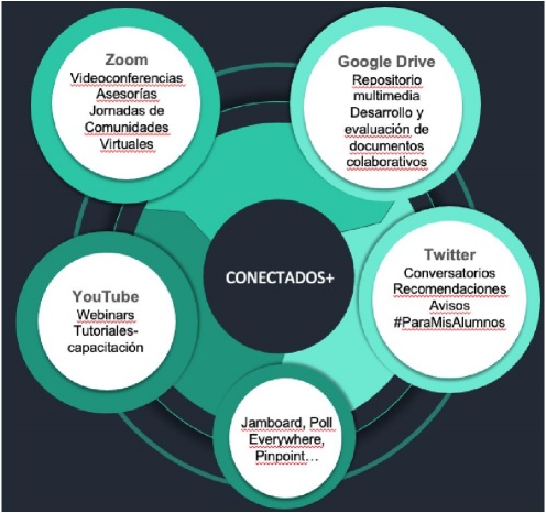 The aim of this article is to share the learning experience resulted from managing the online educational model that we have called “Conectados +”. Several strategies and activities of interaction, co-creation and evaluation are presented, such as setting an exam in dyads in the cloud and in a network based on the theory of connectivism. Moreover, we describe the use of a variety of online platforms (Zoom, Google Drive, Twitter and YouTube) and technological resources (Jamboard, Poll Everywhere and Pinpoint) that make up the ecosystem of teaching-learning experiences of “Conectados +”.