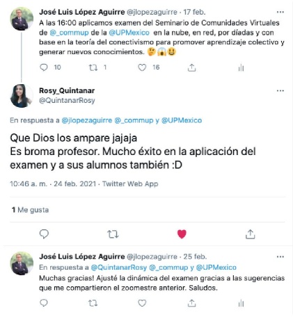 Al respecto, a continuación exponemos cómo impulsamos uno de nuestros Conversatorios en Twitter. Se trata de una dinámica interactiva que se origina con la visualización de un video20 para identificar y comentar ideas relevantes y publicarlas y compartirlas en Twitter de forma precisa y concisa. E, inmediatamente, comenzar una conversación sobre dichas ideas y aportaciones mediante los comentarios e interacciones de estudiantes y docente.