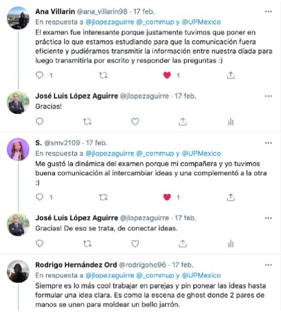 He de confesar que la primera aplicación de este examen fue complicada para mis alumnos del curso agosto-diciembre 2020 (como se infiere en el comentario de la alumna a mi tweet en la imagen 7), pero gracias a sus observaciones y sugerencias logramos una mejora (como se testimonia en los siguientes tweets de mis actuales alumnos de la imagen 8).
